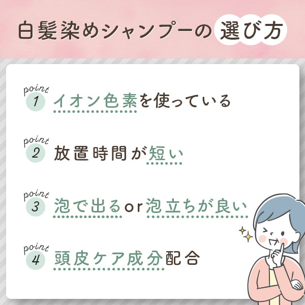 放置時間が短くてもキレイに染まるシャンプーを選びましょう。放置時間が長ければ長いほど髪の毛に負担がかかりますし、お風呂も汚れやすいです。目安は5分以内で収まるシャンプーが理想です。※イオン色素を使ったシャンプーであれば短時間でもキレイに染まりやすいです。